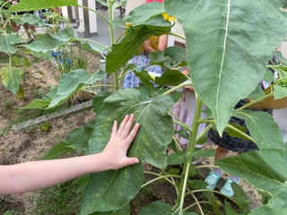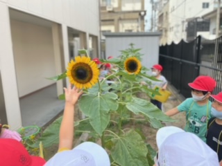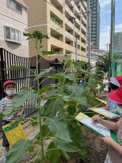 一年生が一学期から育てているひまわりを観察しました。どのひまわりも、自分たちの身長よりも高く伸び、その大きさに驚いていました。種をとるのが楽しみです。