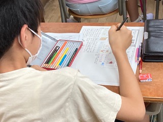 6年生が自然体験学習の新聞作りをしています。たくさんの思い出があり、何を書こうかと悩んでいました。