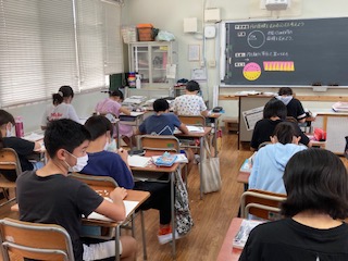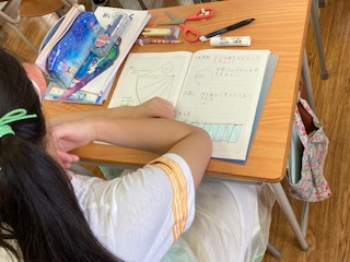 6年生が算数「円の面積」を学習しています。円の面積を求める公式を考えました。円を細かく等分して並べて考えました。16分割して、並べていくと長方形になることがわかりました。そこから公式を導きました。公式を覚えるだけでなく、なぜそのような公式になるのかを考えることが大切です。