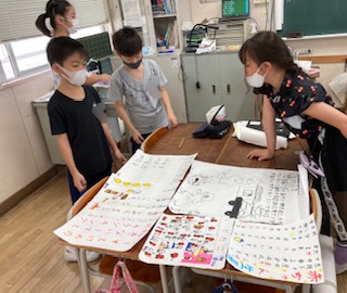 4年生が国語「学校についてしょうかいすることを考えよう」を学習しています。グループで記事を分担し、模造紙大の大きさにまとめました。できあがりが楽しみです。