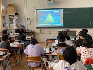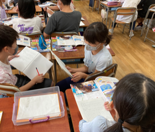 5年生が社会科「水産業のさかんな地域」を学習しています。今日は教育実習生と一緒に「魚を集めてとるまき網」を学習しました。資料集や教科書の写真や図、動画を見て、沖合漁業がどのように行われているか考えました。考えたことをペアで話し合いました。