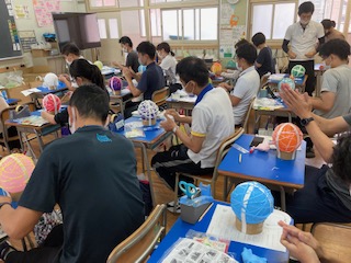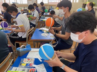 教職員研修として、図画工作の研修をしました。風船ランプを作りました。次年度の指導教材として、教職員で実際に作り、指導のボイントや注意点を学びました。夢中になって作りました。
