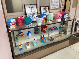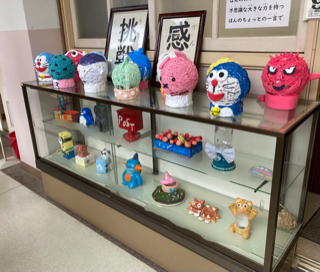 校長室前にあるガラスケースには、子どもたちのアイデア貯金箱が展示しています。また、ガラスケースの上には、教職員研修会で作った風船ランプを飾っています。