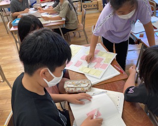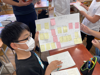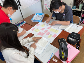 5年生が国語科「問題を解決するために話し合おう」をしています。身の回りにある解決したい議題を選び、みんなで意見を出し合い、出てきた意見を付箋に書き出してまとめています。あいさつ、時間を守る、忘れ物を減らす、外遊びをするために等、色々な議題があり、原因や解決方法を話し合いました。