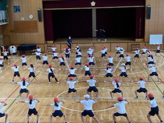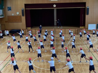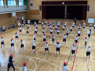 4年生が体育館で運動会のダンスの練習を始めました。今年は、よさこい鳴子踊りに挑戦しています。