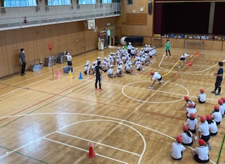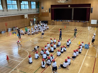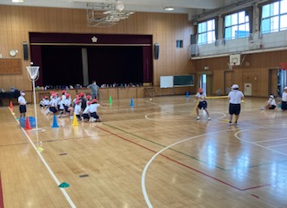 5、6年生が、学年で体育をしました。1対1でミニ綱を引き合っている間に、もう1人が講堂を1周して紅白玉をかごに入れます。入ると、綱引きに加わることができます。どちらが早く綱を引き、ゴールできるか競います。大変盛り上がりました。