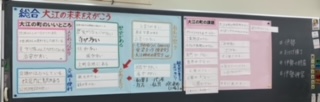6年生の2学期の総合は、『大江の未来を描こう』です。大江の町のいいところや課題を班で話し合いました。そして、意見を出し合い全体でまとめました!