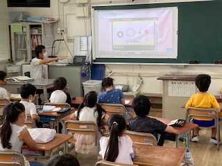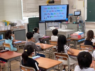 木曜日の朝は、10分間のモジュール英語です。繰り返し音声を聴いて、声を出して言うことで、楽しく英語を学ぶことができています。1年生もしっかりと声を出しています。