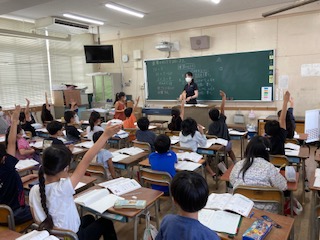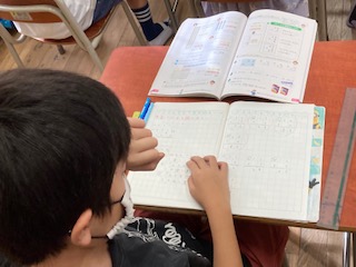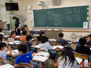 3年生が算数「筆算の仕方を調べよう」を学習しました。かけ算の筆算の仕方を学び、練習問題をして定着を図りました。黒板に練習問題の解答を書きたいと、たくさん手が挙がりました。
