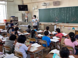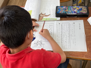 2年生が国語「ニャーゴ」の学習をしています。子どもたちは、すっかり気持ちが登場人物のねこやねずみになっています。今日は、ねこが桃を食べながらどんなことを考えたかをワークシートに書きました。