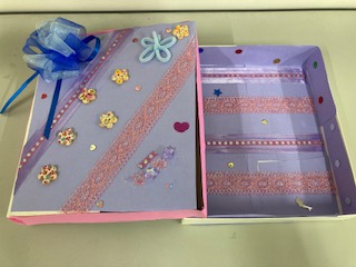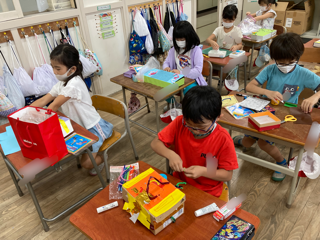 1年生が図画工作「かざってなにいれよう」をしています。箱や箱の中も楽しく飾って、すてきな入れ物を作っています。
