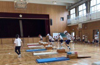 2年生が体育「とび箱を使った運動遊び」をしました。今日は踏み越しとびをしました。片足で踏み切ってとび箱にとび乗り、とび降りました。