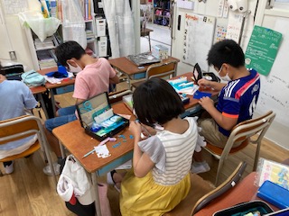 5年生が家庭科で小物作りをしています。手縫いでがんばって作っています。みんなで教え合いながら作っています。