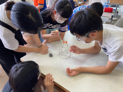 6年生が理科「水よう液の性質」を学習しています。今日は、金属にうすい塩酸を加えた時の変化を調べました。鉄(スチールウール)とアルミニウム(アルミニウムはく)に、うすい塩酸を加えてすぐの様子と最後の様子を調べました。保護眼鏡をかけ、換気をして実験をしました。