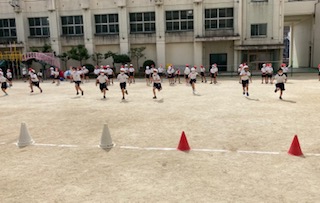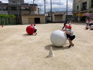 2年生が学年で体育をしました。かけっこ、リレー遊び、大玉ころがしをしました。運動会をめざして、少しずつ練習をしてます。