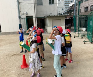 3年生が理科「かげと太陽」の学習をしています。遮光板で太陽を見て、太陽とかげの位置をスケッチしました。