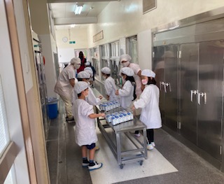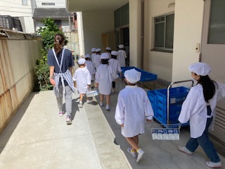 1年生の給食の運搬が上手になりました。給食調理員さんから食器や食缶を渡してもらい、それを安全に教室まで運んでいます。1学期のころを思い浮かべると、しっかりと成長しています。