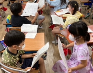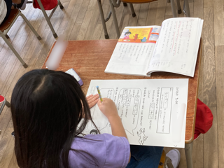 1年生が国語科「サラダでげんき」を学習しています。今日は、のらねこがやってきた様子や教えてくれたことを見つけました。ワークシートに書いたことを隣のお友だちと交流しました。