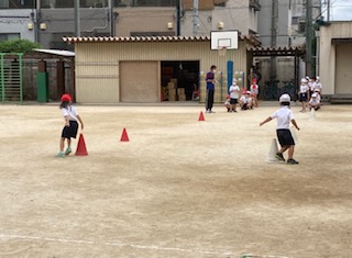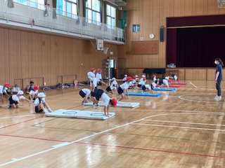 1年生が、運動場ではかけっこ・リレーを、体育館ではマットを使った運動遊びをしました。