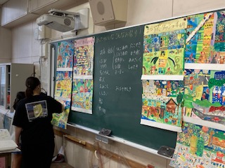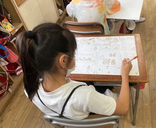 4年生が図画工作「あったらいいなあこんなお祭り」を題材にして、絵を描いています。黒のサインペンを使わずに、茶色のペンで描いています。できあがりが楽しみです。