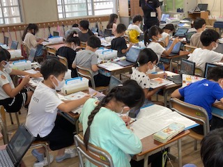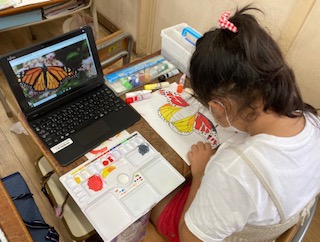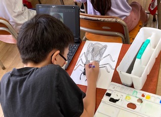 3年生が、昆虫の絵に色をつけました。2色か3色を混ぜて色を作って、塗りました。