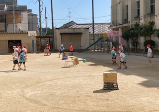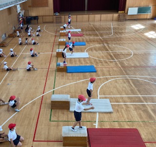 2年生が秋晴れのもと、運動場と体育館で体育の学習をしました。体育館では、とび箱を使った運動遊びを、運動場ではボールゲームの的当てゲームをしました。