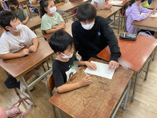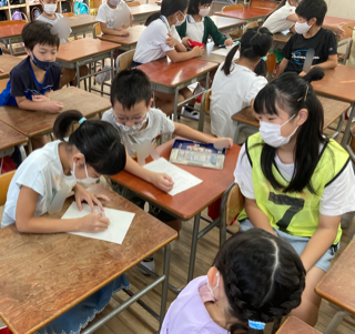水曜日は児童週間でスタートします。今日は集会委員から「ドラえもん」など、絵のお題が発表され、それをひとり5秒間でリレー形式で描いていくゲームをしました。