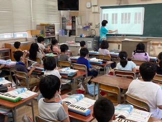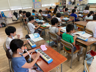 2年生が音楽で「ぷっかりくじら」乗ります旋律遠鍵盤ハーモニカで吹きました。弾むようなリズムを感じながら吹きました。