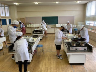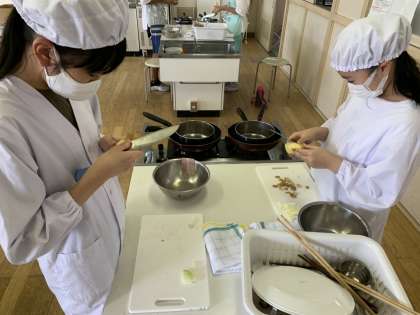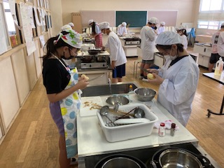 6年生が家庭科調理実習でジャーマンポテトを作りました。包丁でじゃがいもの皮をむき、玉ねぎとベーコンを炒めました。感染防止対策として、クラスを半分に分け、ひとりで調理をしました。