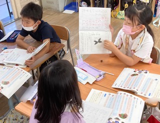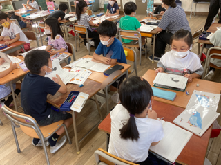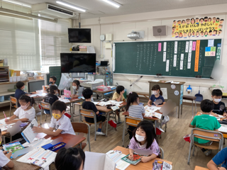 1年生が国語科「なにに見えるかな」を学習しています。ペアになって質問を考え、話を楽しくつなぐ学習をしました。