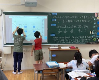 5年生が算数「分母の違う分数の計算の仕方」を学習しました。通分をして分母をそろえて計算しますが、その際に最小公倍数を見つけることがポイントです。