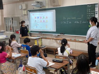 4年生が外国語活動をしました。担任とC-NETの先生とのコラボで行いました。2人で会話の見本を示して、子どもたちが楽しく英語に親しむことができるようにしています。