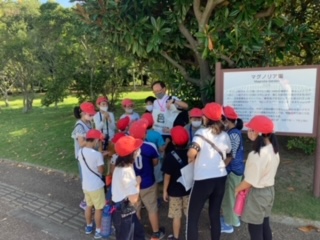 たてわり班でオリエンテーションをしています!先生がいるポイントで、協力してゲームやクイズに答えます。植物園内には、いくつかのキーワードが置いてあったり、校長先生がぶら下げたりしています。そこにかかれた言葉を集めて並べ替えるとクイズになります!ゴールでクイズの答えが正解するか楽しみです!