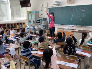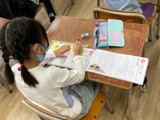 1年生が新出漢字を学習しました。書き順や花、ため、はらいに注意して、空書かをしました。そのあと、漢字ドリルで練習しました。姿勢正しく丁寧に書いています。