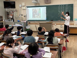 2年生が国語科「ビーバーの大工事」を学習しています。お話を読んでいき、動物の秘密を探ります。とても楽しい教材です。