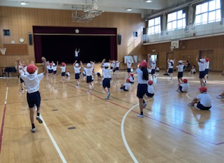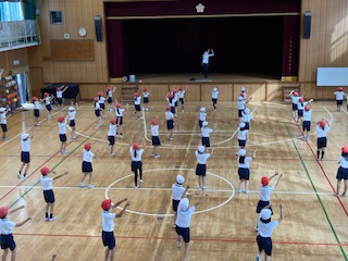 3年生が運動会の団体演技「よさこい鳴子おどり」の練習をしています。まだ鳴子を持たずに、振り付けを練習しています。