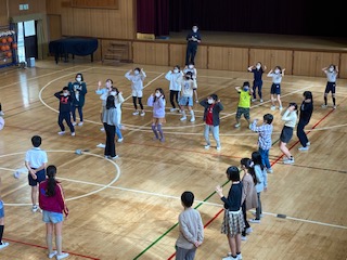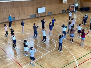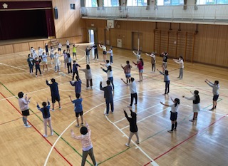 運動会の応援団が、昼休みに体育館で練習をしています。フレーフレーと団長の声に合わせて、元気に応援練習をしています。自分たちで考えた振り付けに合わせて、声を出していました。
