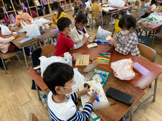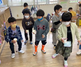 1年生が松ぼっくりけん玉を作りました。先日のたてわり班遠足で行った長居植物園で集めた松ぼっくりを使って、手づくりけん玉を作りました。