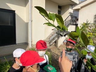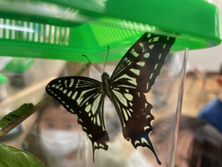 一年生活科「むしと なかよく なろう」で育てていたアゲハの幼虫が、今朝成虫になっていました。卵をつかまえた辺りで逃してあげました。「長生きしてねー!」