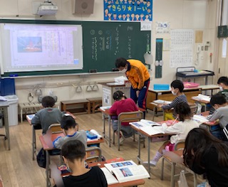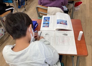 1年生が国語「いろいろなふね」を学習しています。乗り物についての説明文を読んで、役目、つくり、できることの3つをまとめています。
