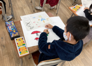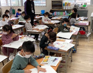 1年生が図画工作「のってみたいな いきたいな絵」をしています。ワークシートに何に乗りたいか、どこへ行きたいかを記入して、下絵を描きました。ワークシートを使って画用紙にパスで描きました。