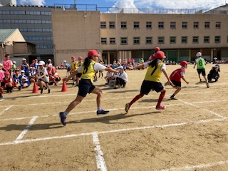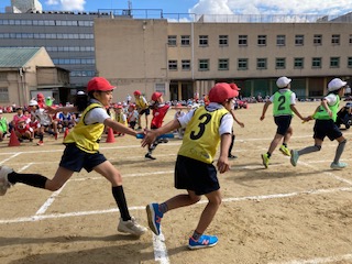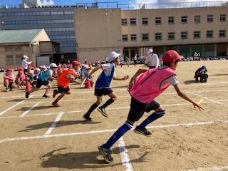 4年生は、ひとり半周の紅白対抗リレーをしました。バトンパスがスムーズにいけるかが、勝敗の分かれ目でした。