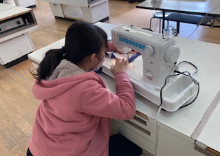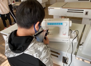 5年生が家庭科でミシンを使ってエプロンを作っています。慣れるまで恐る恐るミシンを動かしています。