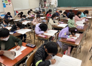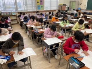 大阪市学力経年調査の一日目です。今日は3年生から6年生が、国語と社会、児童質問紙を行いました。初めての経年調査を受ける3年生は、緊張しながらもがんばっていました。普段のテストは紙一枚のテストですが、経年調査は冊子になっていますので、少し戸惑ったかもしれません。みんな集中して取り組んでいました。