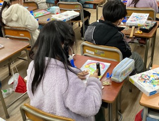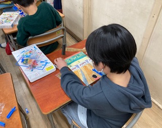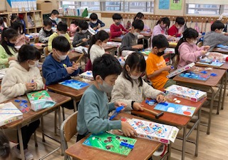 3年生が図画工作「くぎ打ちゲーム」を作っています。板に金づちで鍵を打ちますが、とても慎重に鍵を金づちでトントンと打ちつけていました。