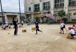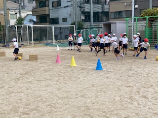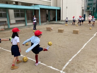1年生が体育「ボールけりゲーム」を学習しました。ダンボールの的や三角コーンにボールを蹴って当てるゲームをしました。的にボールが当たると歓声があがりました。