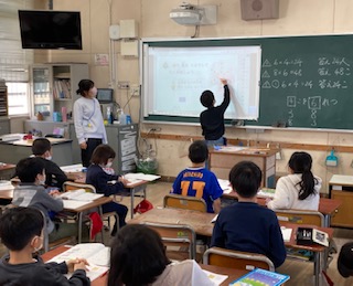 2年生が、算数「たしかめよう」の問題で、かけ算の九九を工夫して計算する学習をしました。自分の求め方を図や式に表し発表していました。