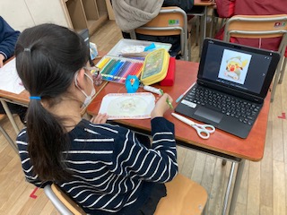 上の写真は、イラスト・工作クラブです。イラストを描いて、それを入れる額縁を作っています。
