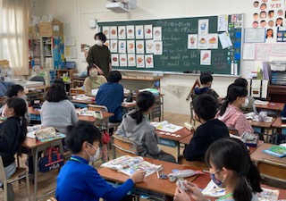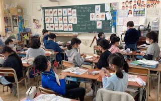 5年生が外国語(英語)の学習を英語専科の先生としました。食べ物や飲み物の言い方に慣れるため、カードを使って隣のお友だちと会話をしました。