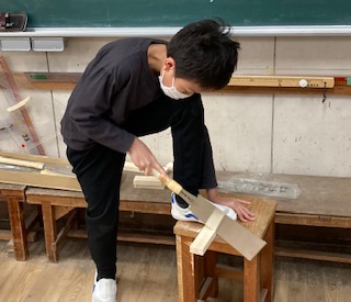 4年生が木をのこぎりで切って、作品を作っています。今日は完成図にもとづいて、設計をしたり木をのこぎりで切ったりしました。のこぎりを初めて使いました。少し苦労していました。